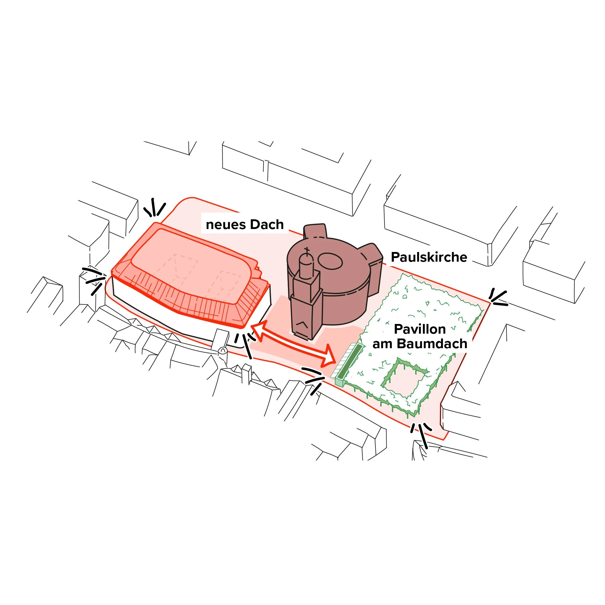 eDie Paulskirche als symbolträchtiger wie architektonisch bedeutsamer Ort wird als Ausgangspunkt gesetzt und räumlich wie konzeptionell zum „Forum“ weiterentwickelt. Das zukünftige „Forum der Demokratie“ umfasst das städtebauliche Ensemble: Paulskirche, alte Stadtkämmerei sowie den neuen Pavillon. Städtebaulich bilden die drei Gebäude einen neuen Platz in ihrer Mitte. Dieser ist Vorplatz, Ankunftsort, Austauschort und öffentliches Foyer in einem – das Herzstück des Forums.