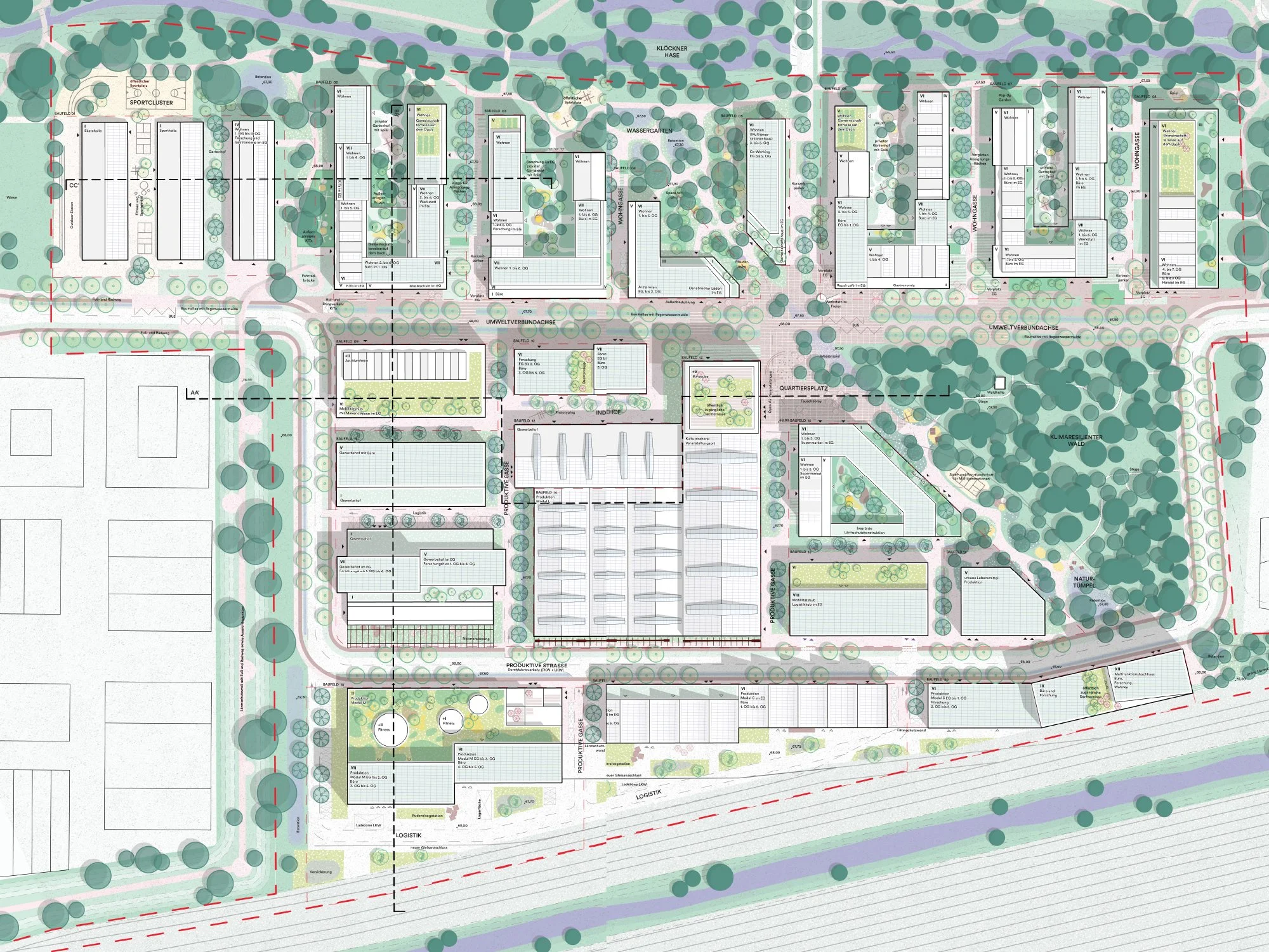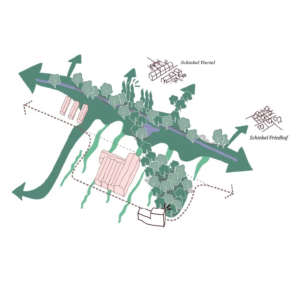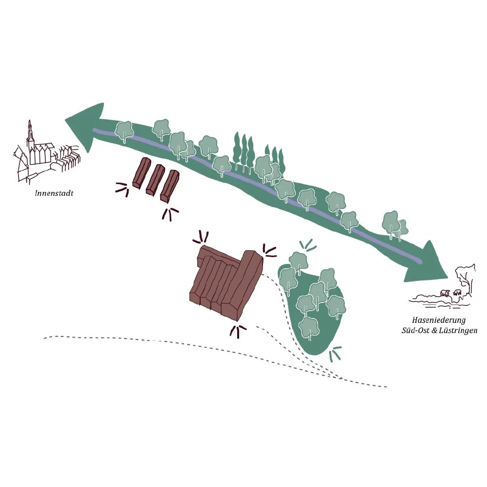 Vernetzung: Das neue Quartier nimmt starken Bezug zum bestehenden grün-blauen Korridor entlang der Klöckner Hase auf, der aktiv in das Gebiet hineingezogen wird. Die neue grüne Diagonale verbindet den Wald mit der biodiversen Natur des Wasserreservoirs und rückt damit Qualitäten aus der Natur ins Innere des Quartiers.