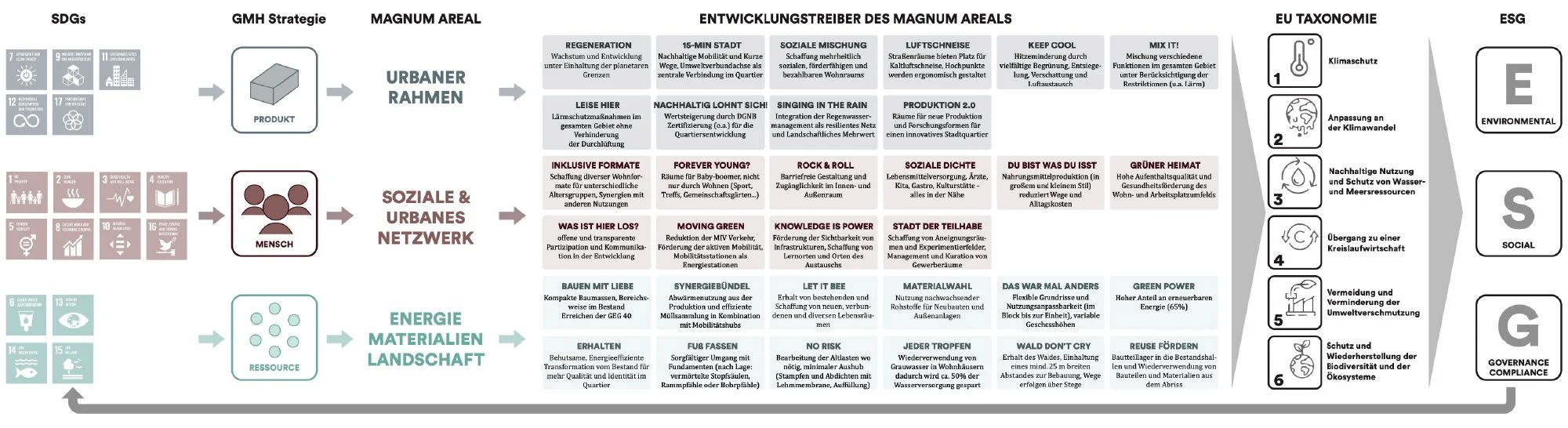 Die «Osnabrücker Macherei» strebt in vielerlei Hinsicht eine nachhaltige Entwicklung an, um bis 2039 Klimaneutralität zu erreichen. Zentral sind dabei die 17 Ziele für nachhaltige Entwicklung der UN. Sie bilden die Grundlage für die drei zentralen Handlungsfelder der GMH GmbH: Produkt, Mensch und Ressource. Die Grafik zeigt die spezifischen entwurfsleitenden Prinzipien, die die Kernwerte der GMH- Nachhaltigkeitsstrategie entsprechen, und sowohl den ESG-Kriterien als auch der Europäischen Taxonomie zugeordnet werden.
