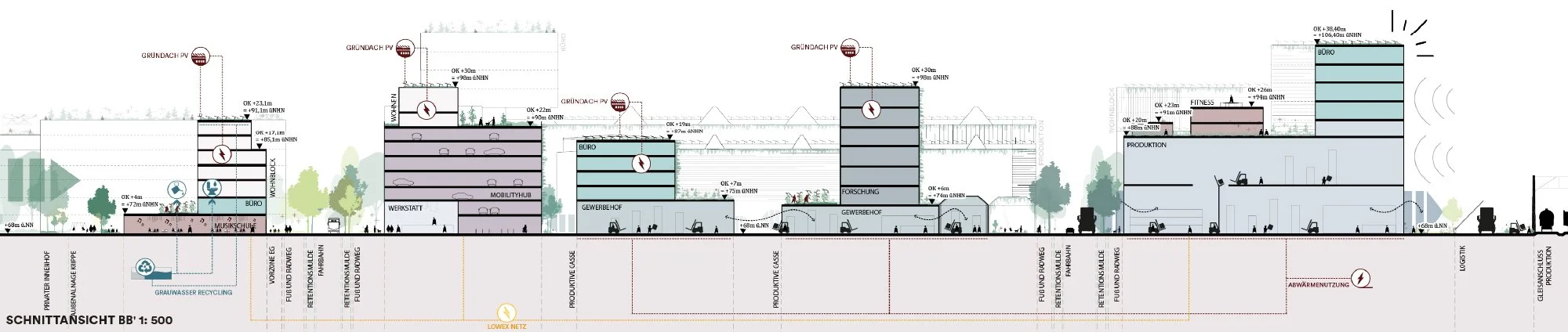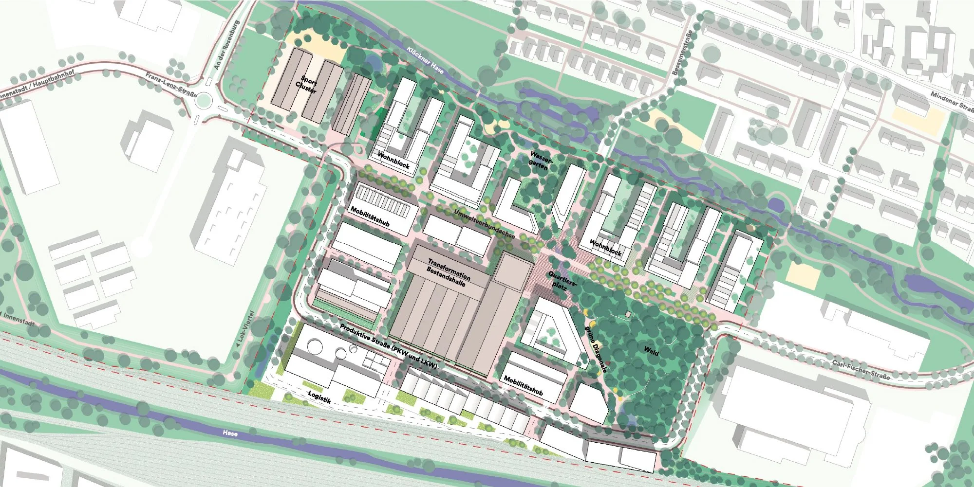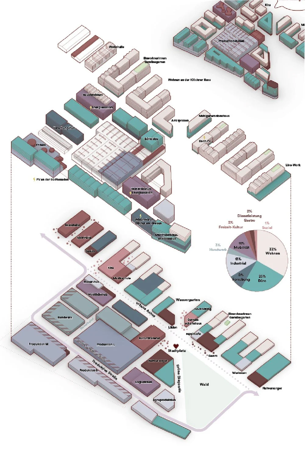 Die «Osnabrücker Macherei» sieht eine ausgewogene Nutzungsmischung vor. Die verschiedenen Funktionen werden auf der Ebene des gesamten Gebietes, der Baufelder und der Gebäude sinnvoll durchmischt. Dabei werden Synergien genutzt (Lärmschutz, Verkehrsbündelung, Abwärmenutzung) und Zielkonflikte gelöst. Die produktiven Bausteine werden in das Quartier so integriert, dass sie sichtbar und erfahrbar sind (Schaufenster bei den großen Modulen, Werkstätte und Maker’s Spaces in den Wohnblöcken). Die Erdgeschosszone konzentriert publikumswirksame Nutzungen entlang der Umweltverbundachse. Insbesondere am Quartiersplatz kommen verschiedene Nutzungen zusammen (Kulturdreherei, Nahversorgung, Arztpraxen, Osnabrücker Läden, Repaircafè).